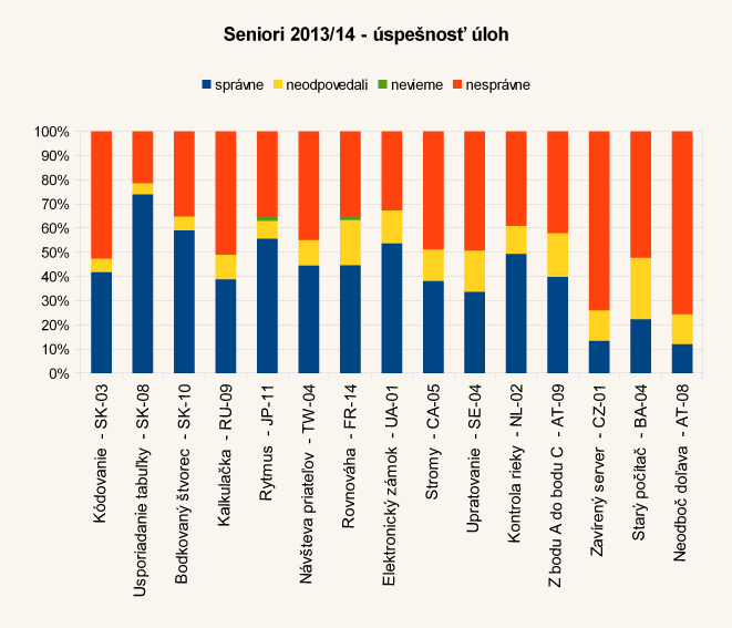 - nevieme v diagrame úspešnosti úloh znamená, že náš súťažný systém nedokázal zaznamenať odpoveď daných žiakov. To sa stáva zásadne len pri interaktívnych úlohách keď počítač buď nemá nainštalovaný Flash player alebo z nejakých dôvodov nainštalovaný Flash player nespolupracuje správne s naším súťažným systémom.
